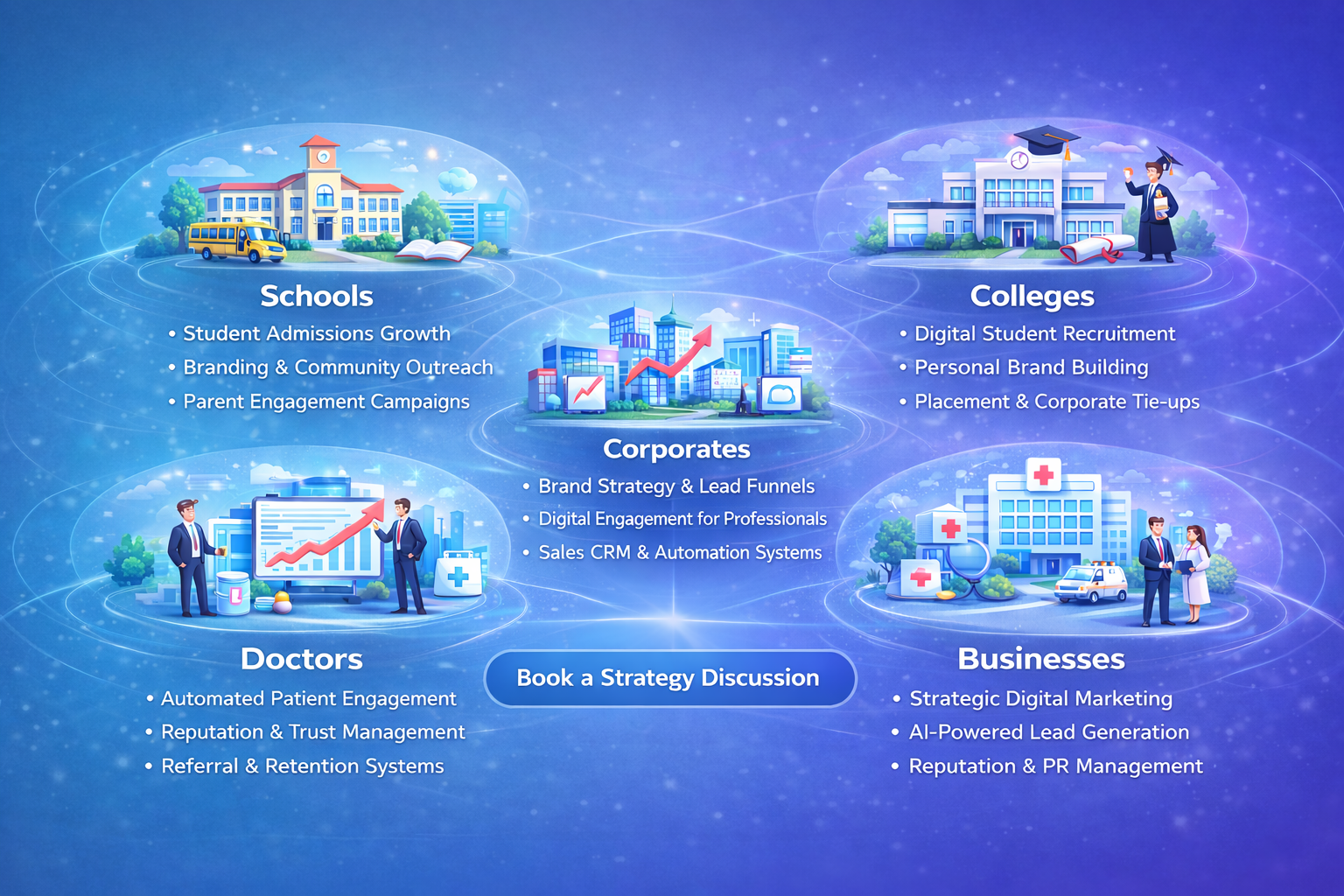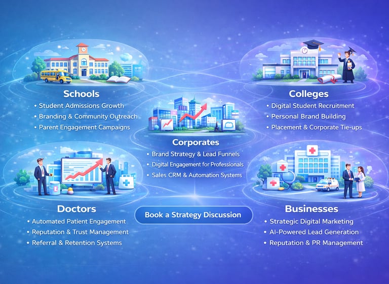 Tailored strategy, marketing and AI solutions designed to support growth across education, healthcare, corporates and businesses.